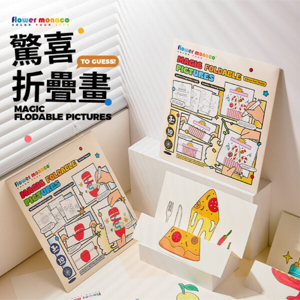 兩大主題可選:繽紛趣味/動物主題 每本10張圖稿,創作靈感不重複! 畫一畫、折一折,圖案瞬間變魔術 展開是完整畫面,折起來竟然出現另一個驚喜圖案。
