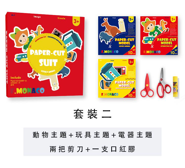內含:安全剪刀一把、鐵片剪刀一把、動物主題剪紙10張、玩具主題剪紙10張、電器主題剪紙10張、口紅膠一支