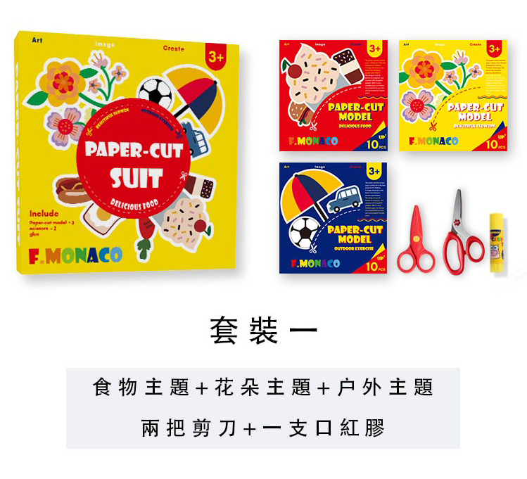 內含:安全剪刀一把、鐵片剪刀一把、食物主題剪紙10張、花朵主題剪紙10張、戶外主題剪紙10張、口紅膠一支