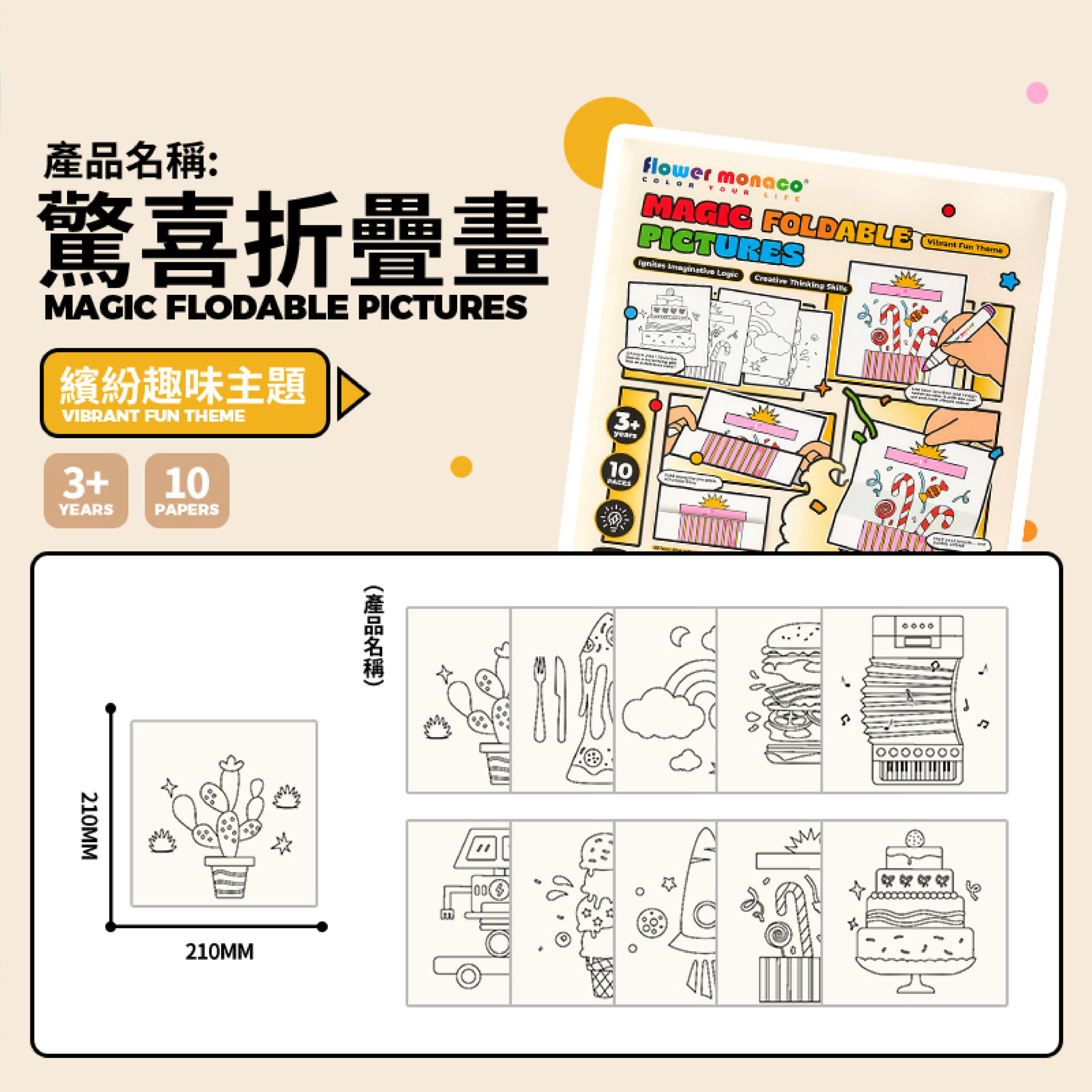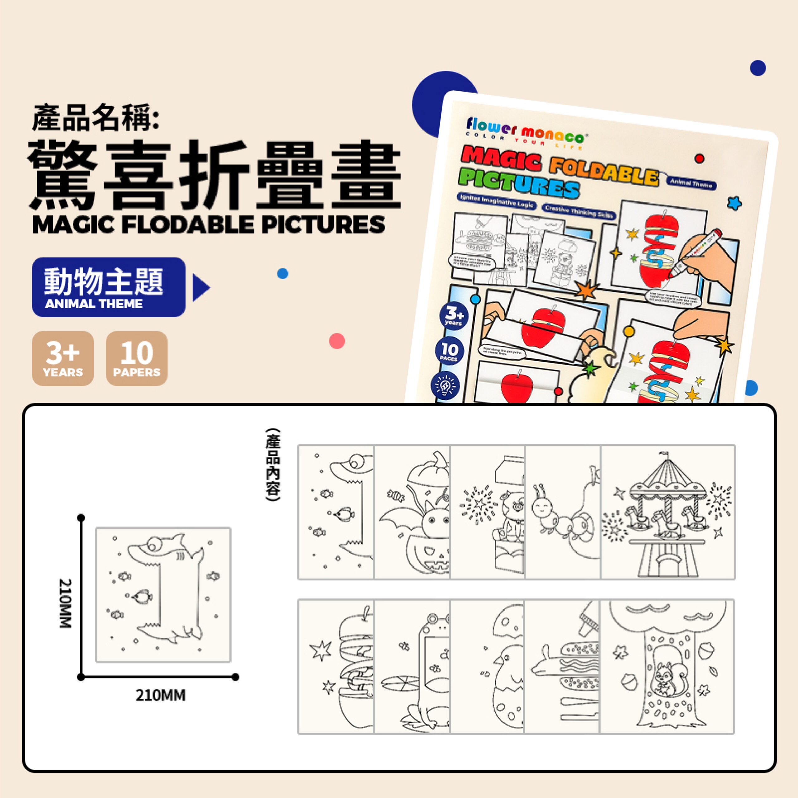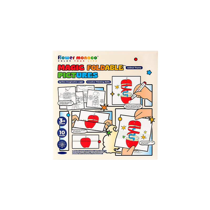 兩大主題可選:繽紛趣味/動物主題 每本10張圖稿,創作靈感不重複! 畫一畫、折一折,圖案瞬間變魔術 展開是完整畫面,折起來竟然出現另一個驚喜圖案。