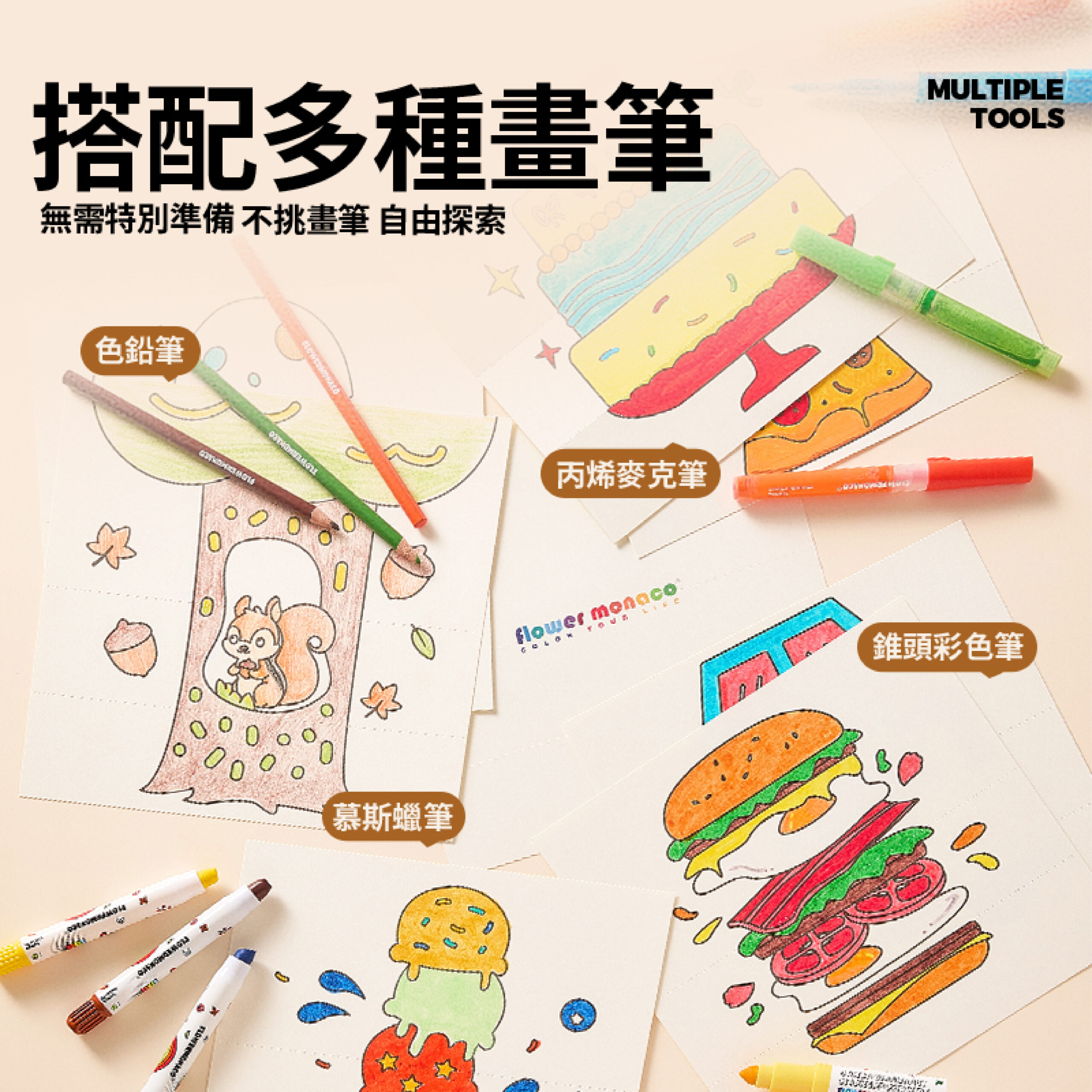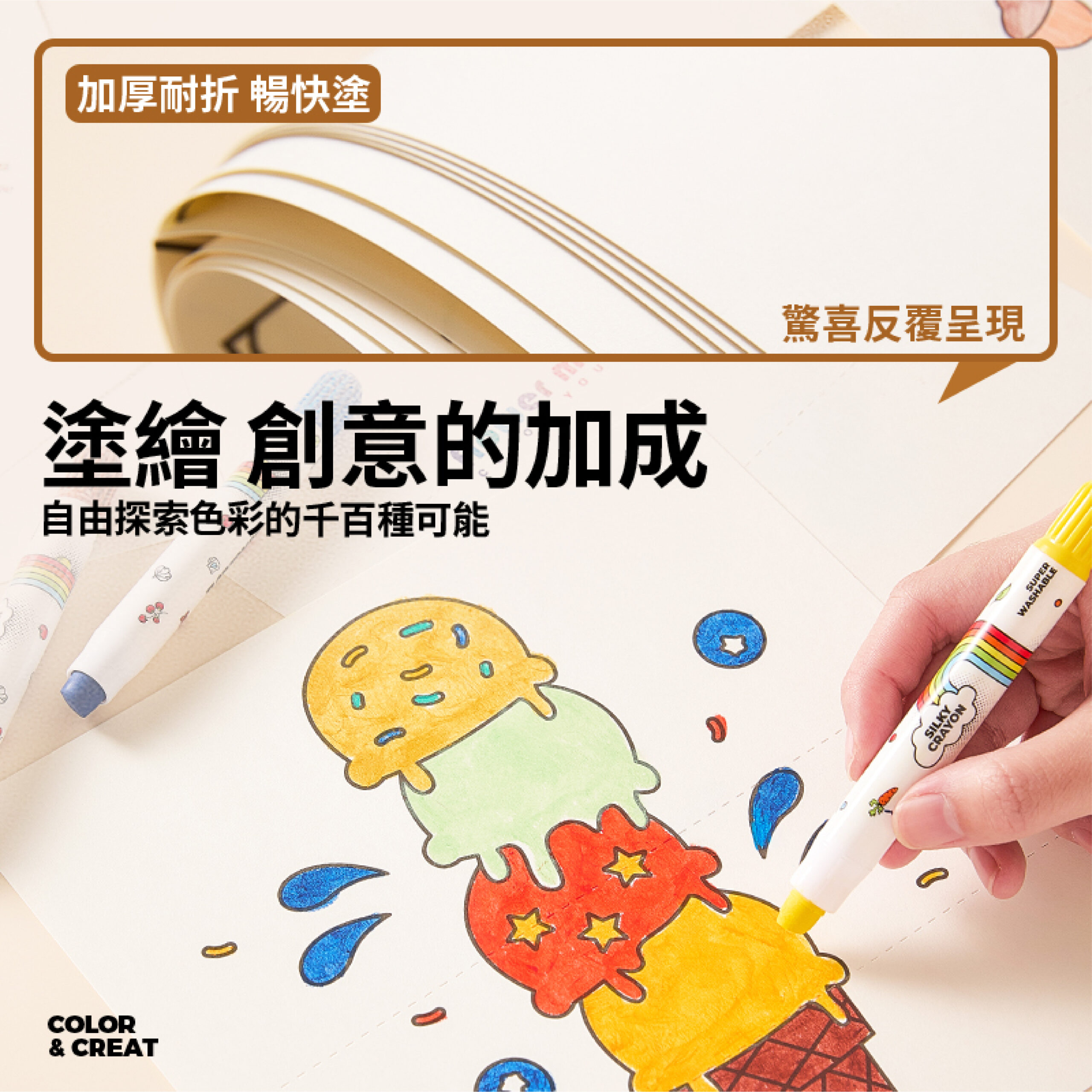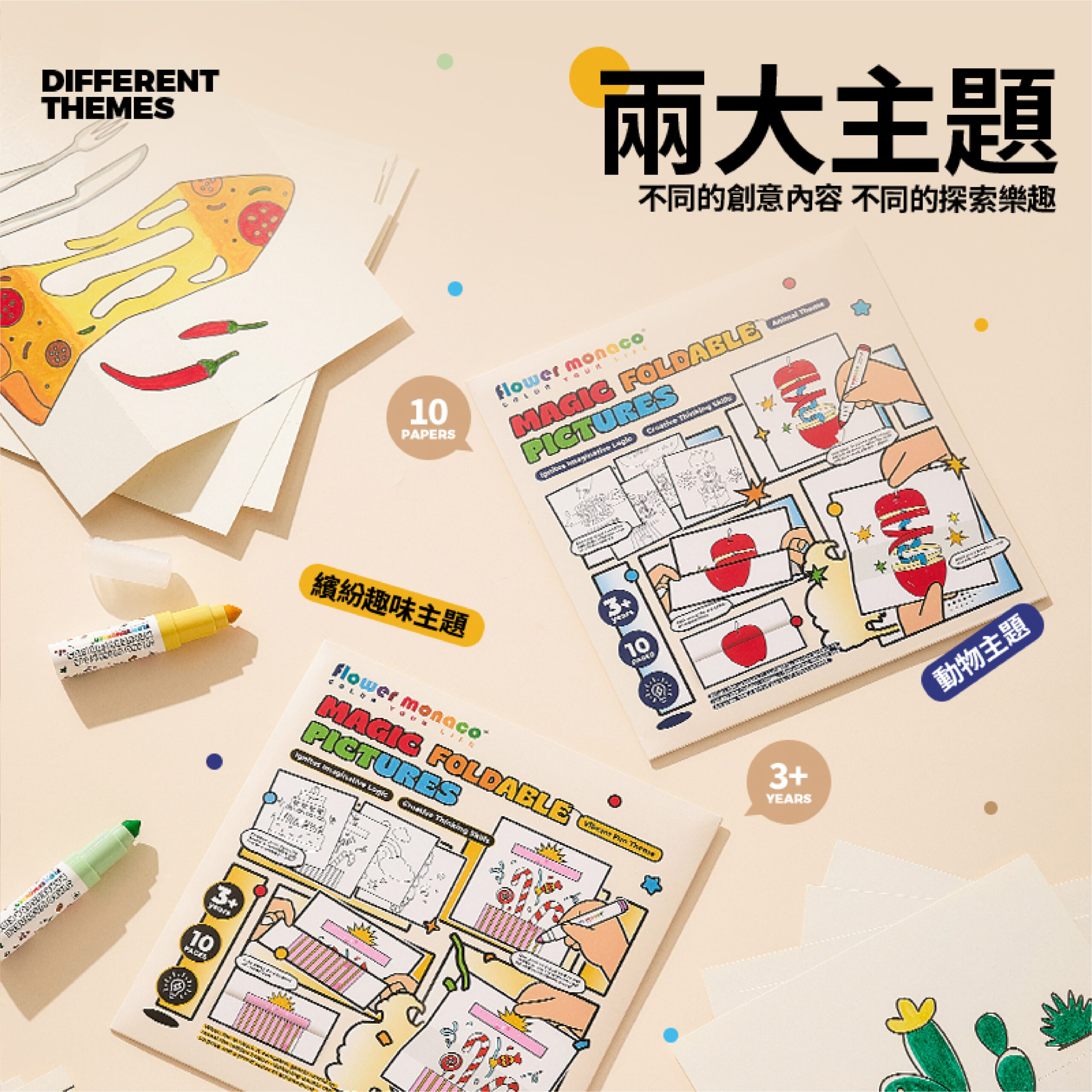 兩大主題可選:繽紛趣味/動物主題 每本10張圖稿,創作靈感不重複! 畫一畫、折一折,圖案瞬間變魔術 展開是完整畫面,折起來竟然出現另一個驚喜圖案。