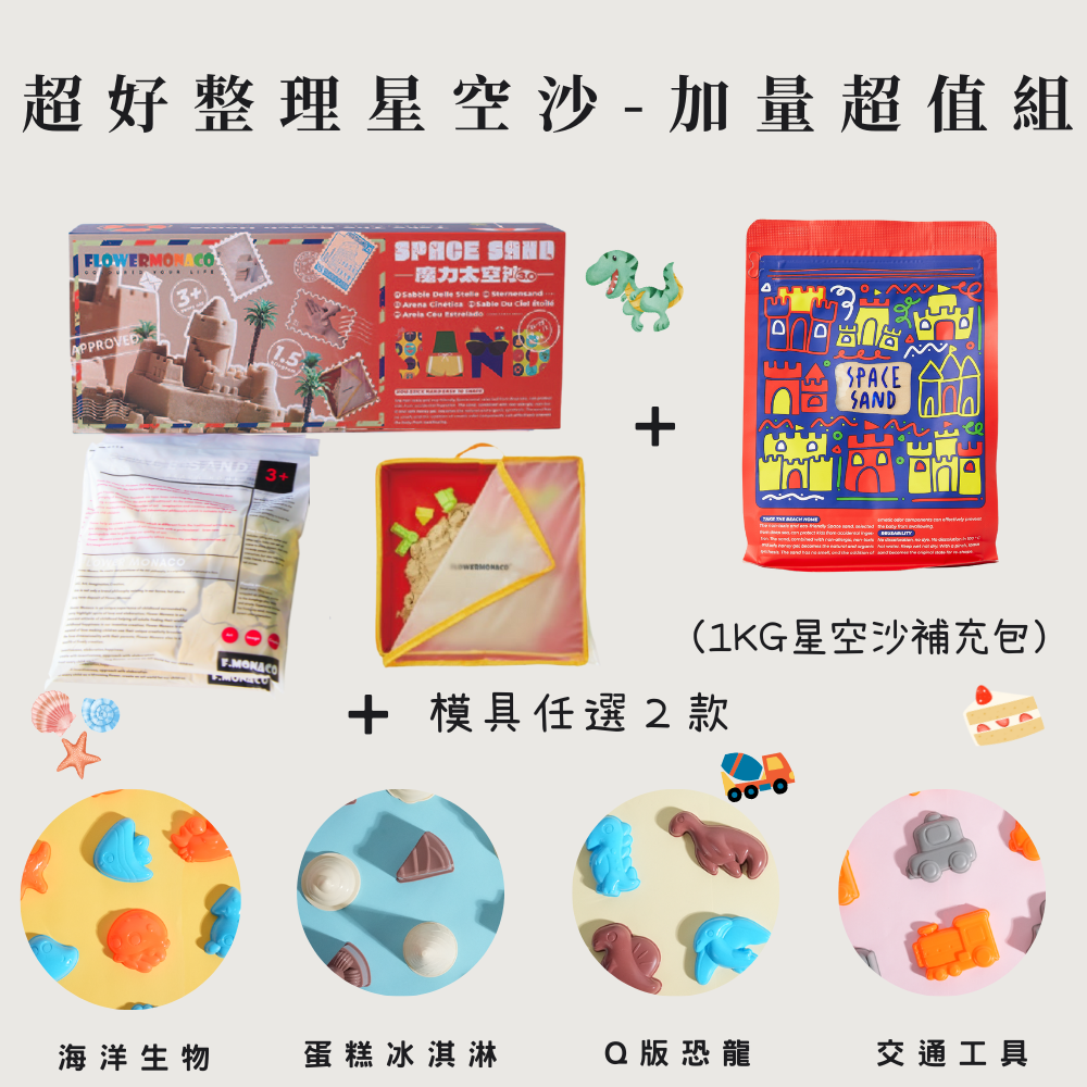 趣味星空沙套組(1.5kg星空沙+1套城堡模具+工具+遊戲紅色加蓋折疊沙盒一個)