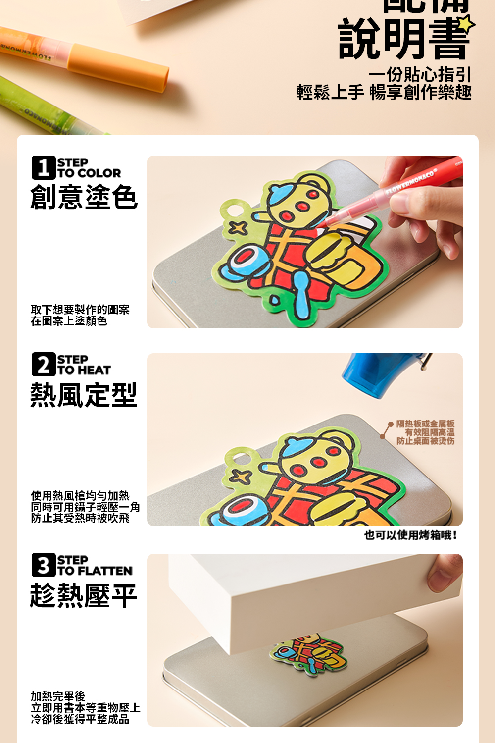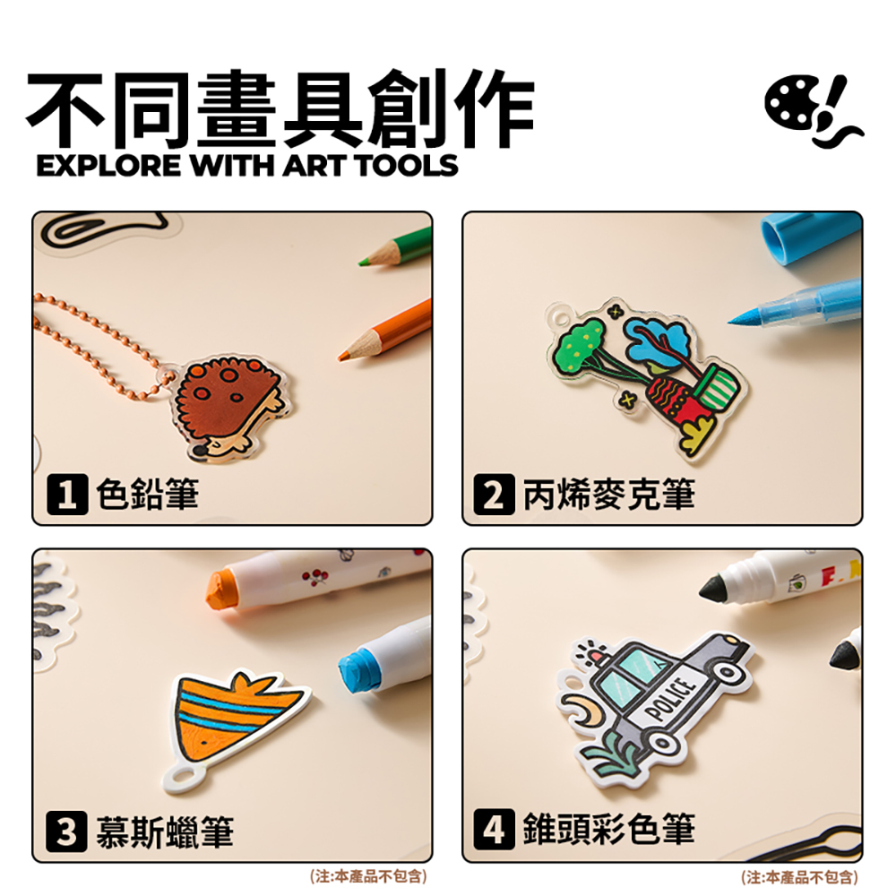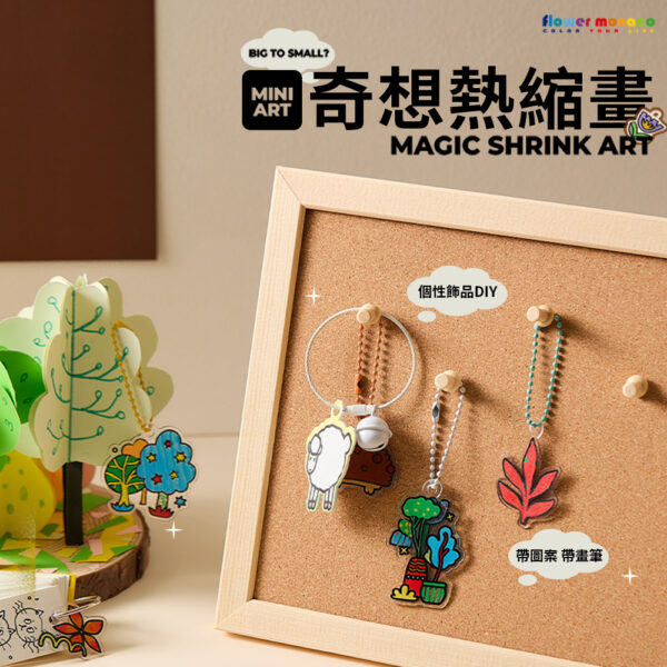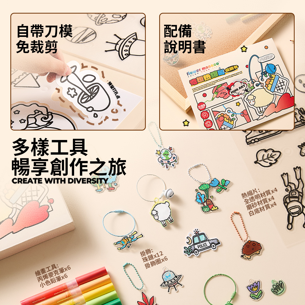 內含3種不同材質熱縮片(透明/磨砂/不透明白色) 珠鍊*12、掛飾圈*6、丙烯麥克筆*6、小色鉛筆*6 顏色飽和好上色,在家就能完成專屬吊飾~ 一盒玩出「會縮小的魔法」創作體驗。 孩子親手上色、加熱定型,成品瞬間縮小超有成就感!