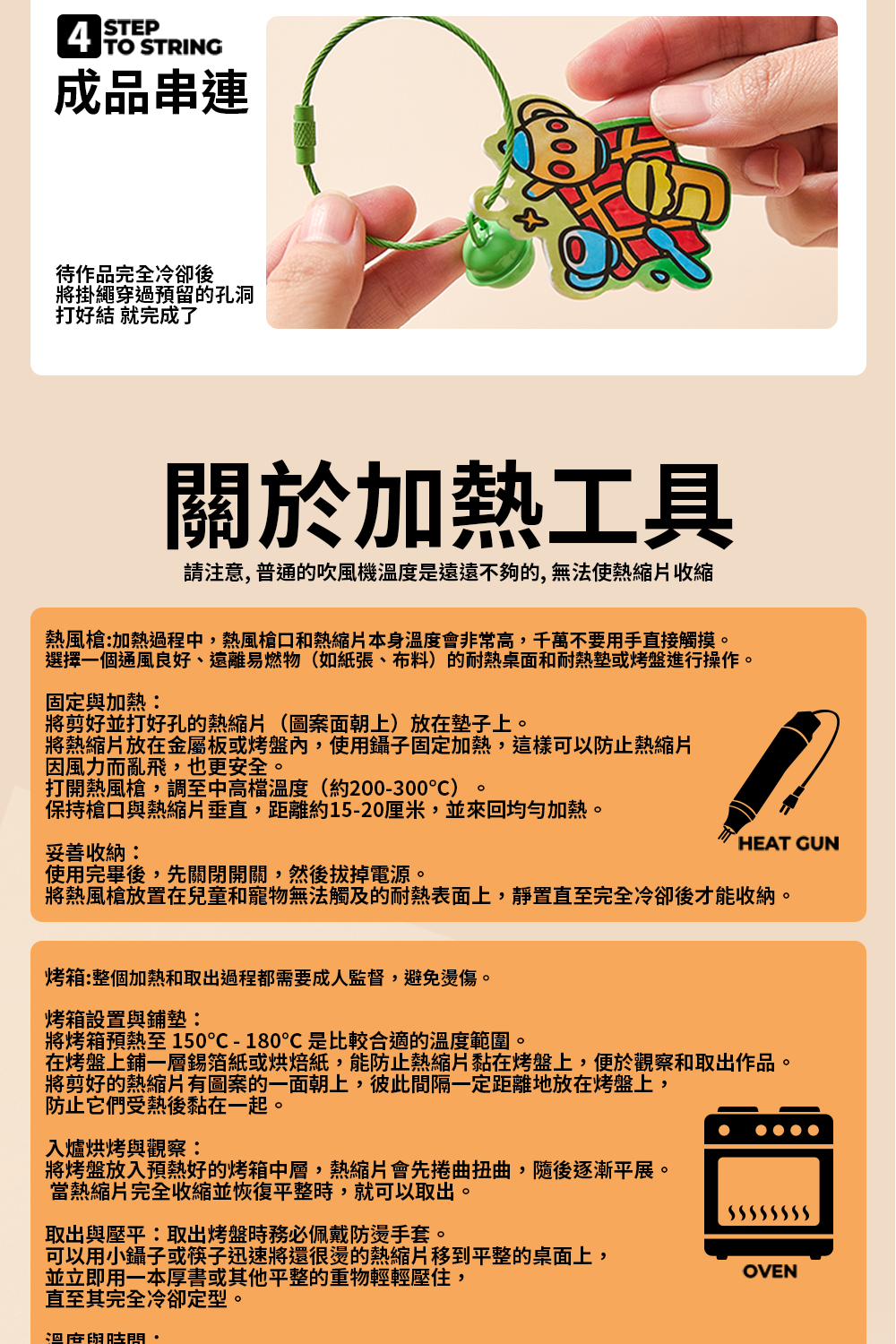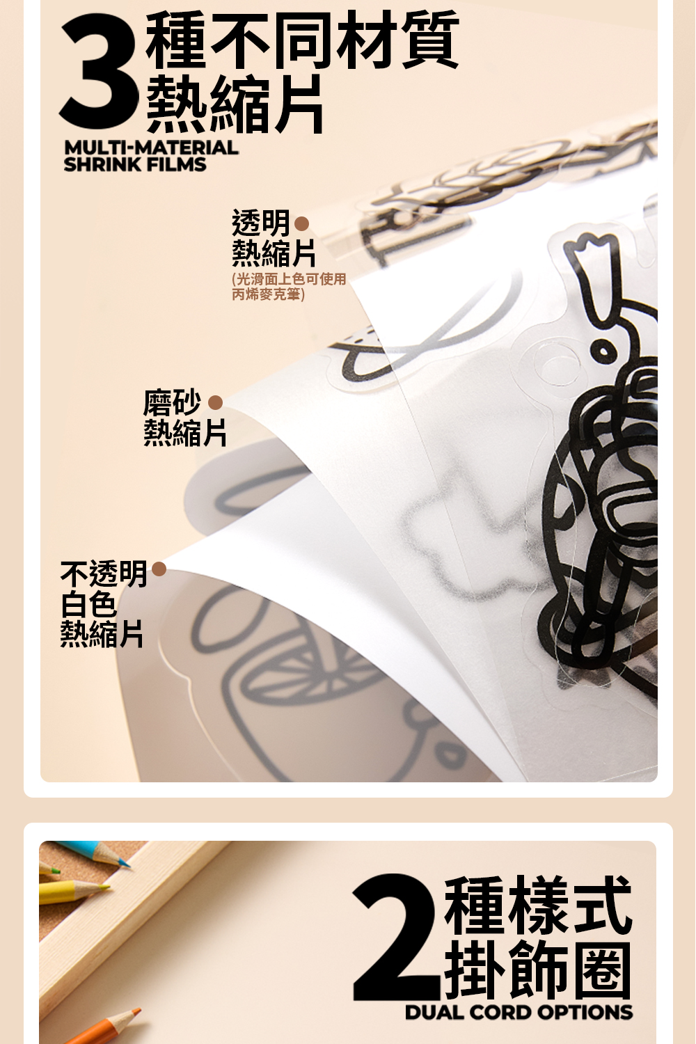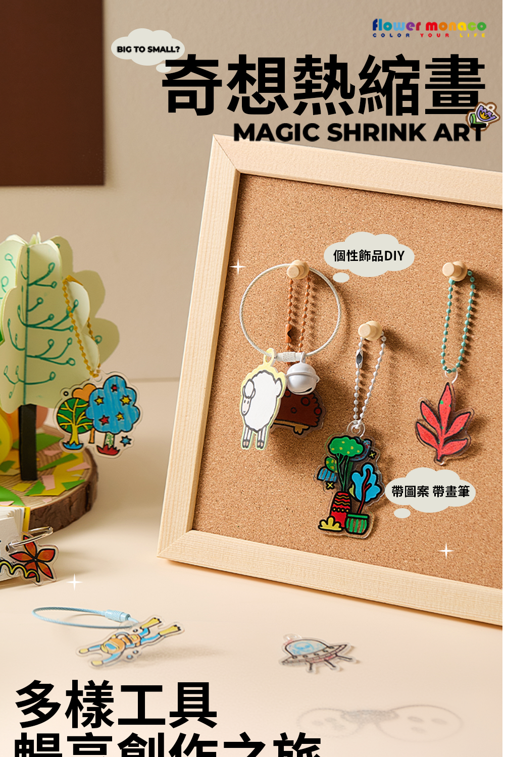 內含3種不同材質熱縮片(透明/磨砂/不透明白色) 珠鍊*12、掛飾圈*6、丙烯麥克筆*6、小色鉛筆*6 顏色飽和好上色,在家就能完成專屬吊飾~ 一盒玩出「會縮小的魔法」創作體驗。 孩子親手上色、加熱定型,成品瞬間縮小超有成就感!