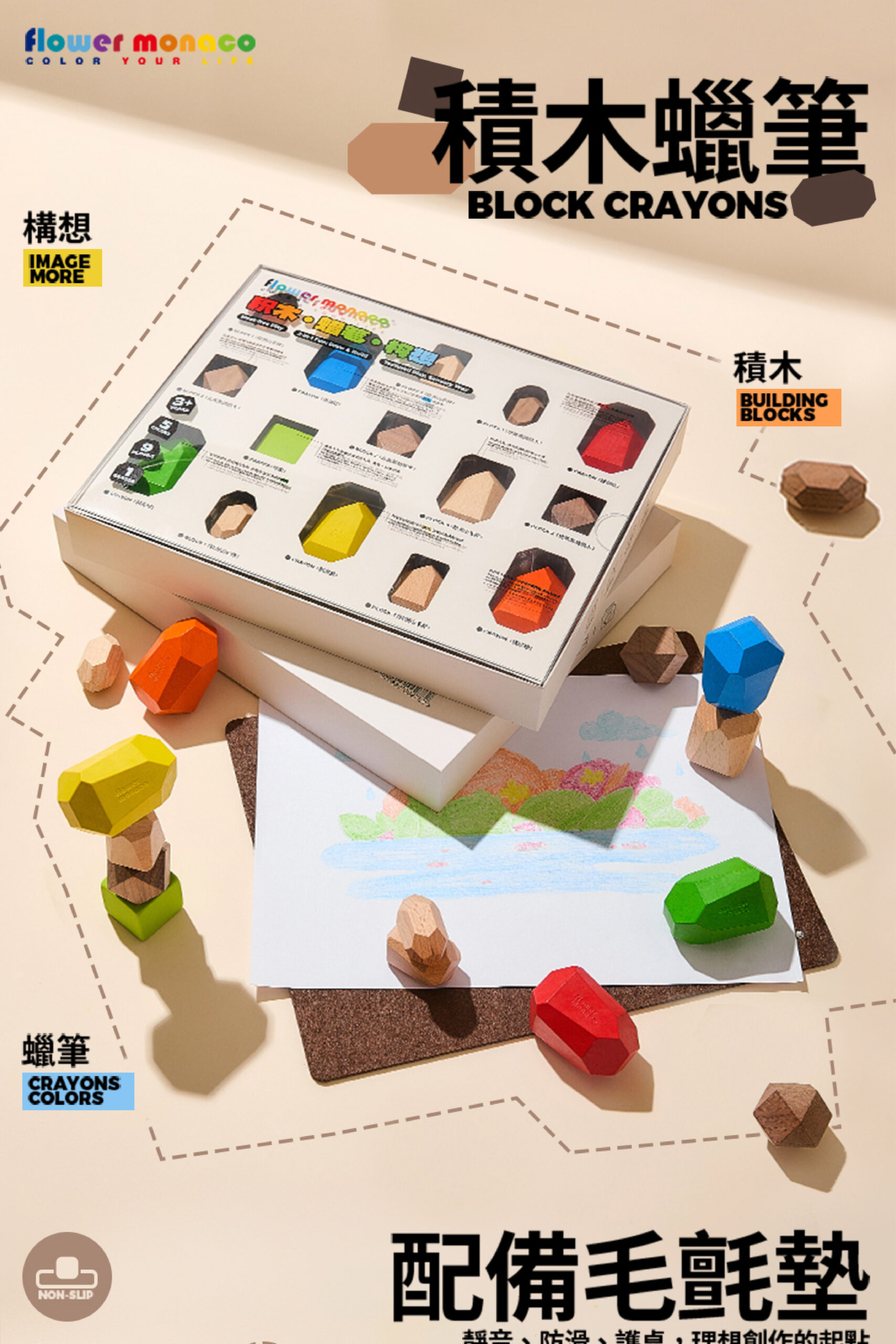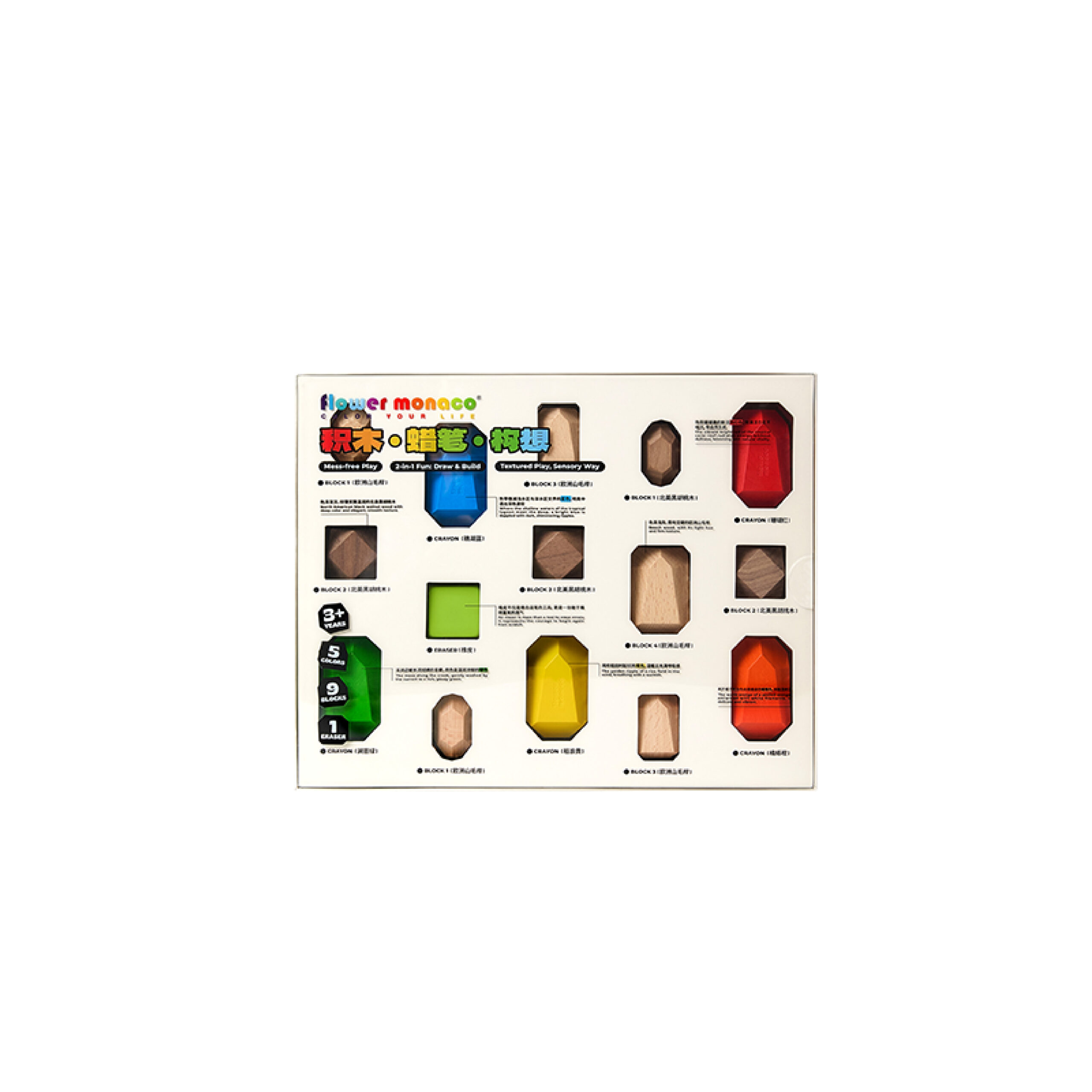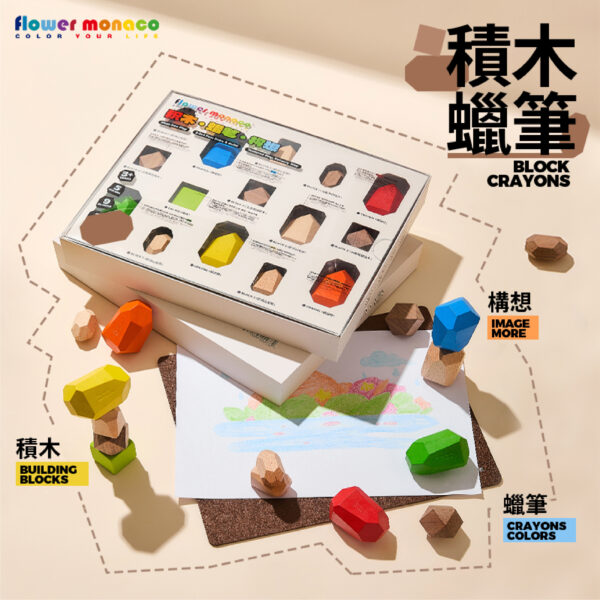 內含蠟筆*5、造型積木*9、方形橡皮擦*1、毛氈墊*1 不只是蠟筆,更是幾何美學啟蒙玩具~ 從堆疊積木到畫畫創作,一盒多種玩法超耐玩