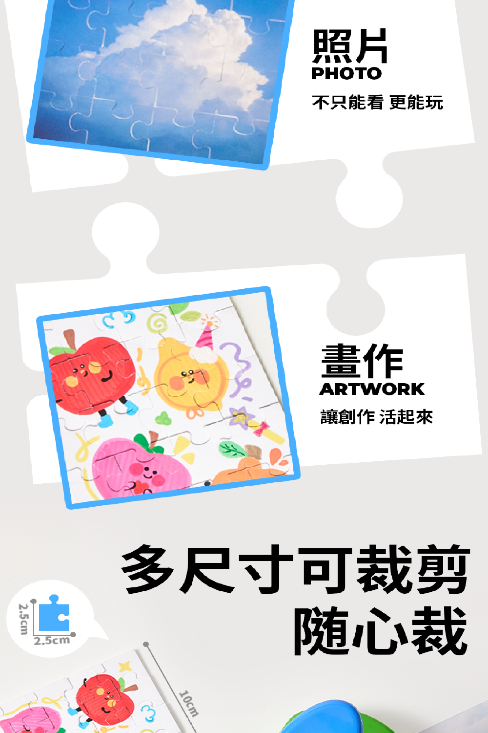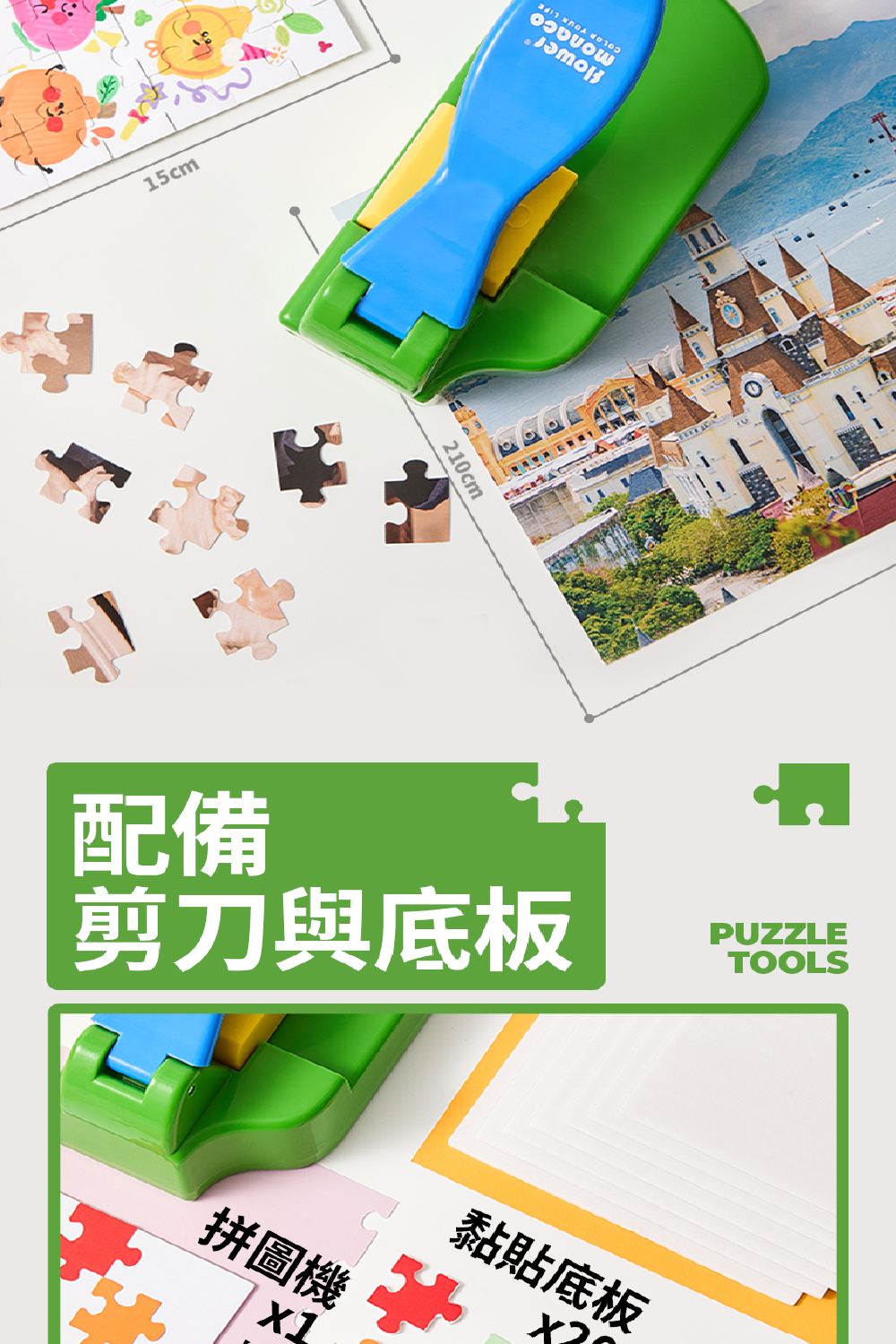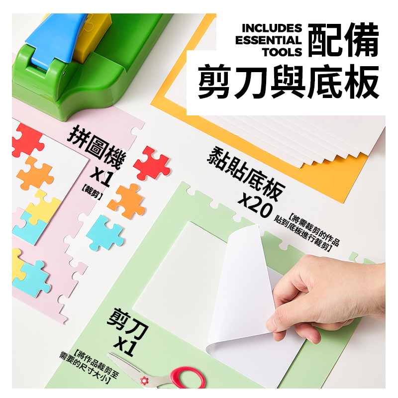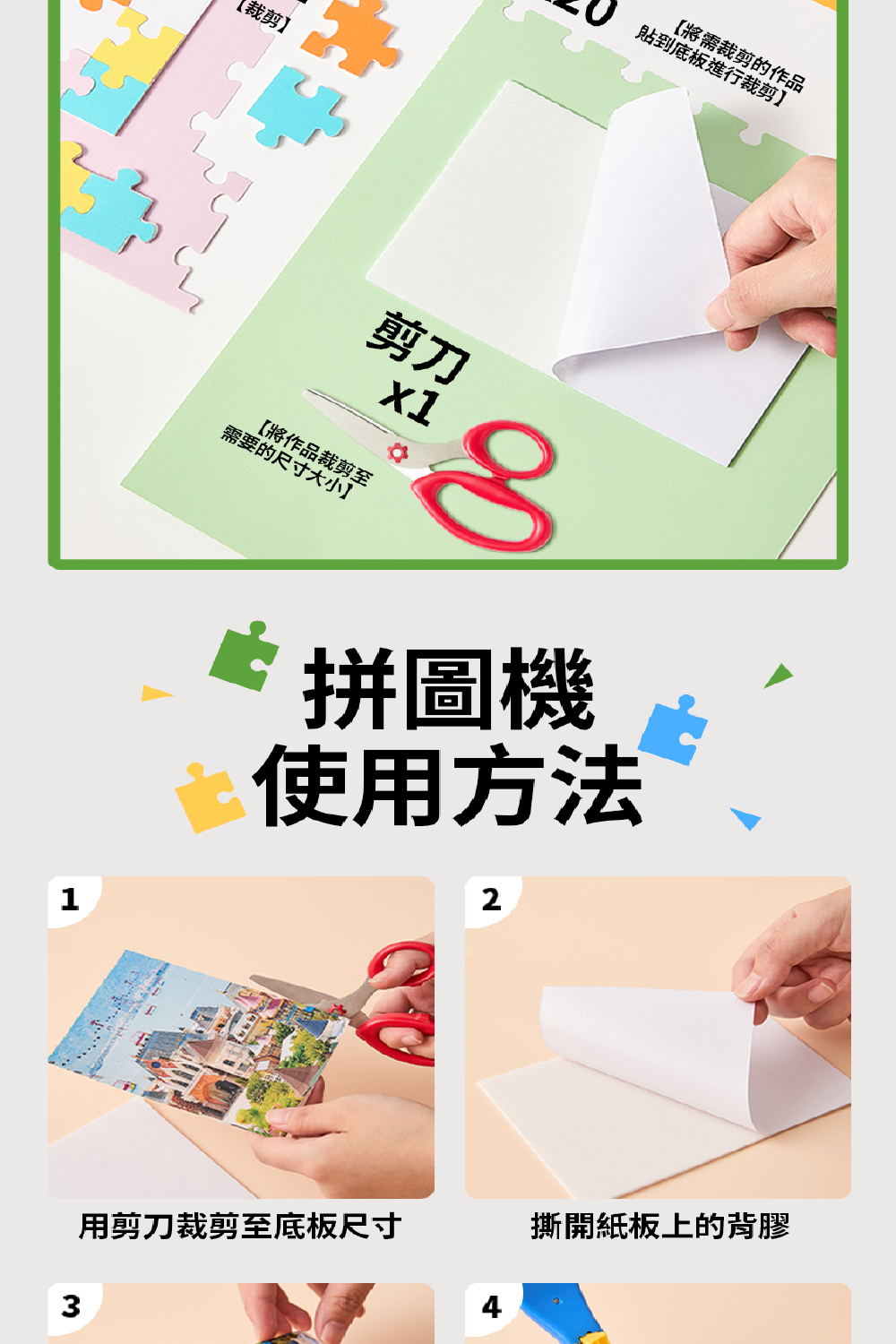 內容物:拼圖機x1、可黏貼底板x20、剪刀x1 一鍵壓製,照片秒變專屬拼圖,CP值超高 孩子的畫作、旅行照片都能變成獨一無二的實體玩具。