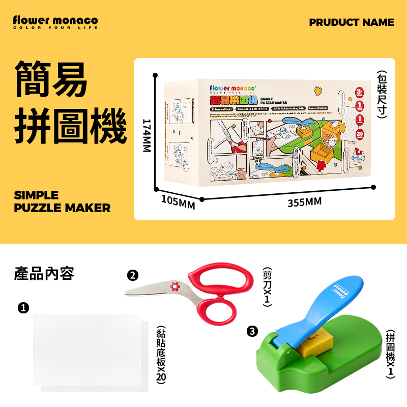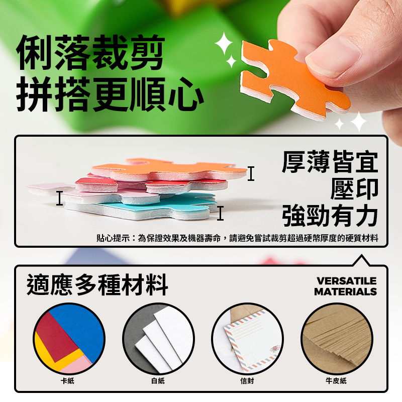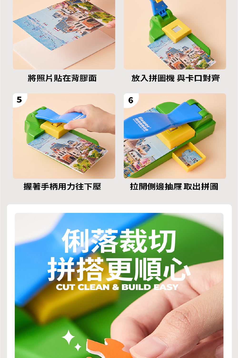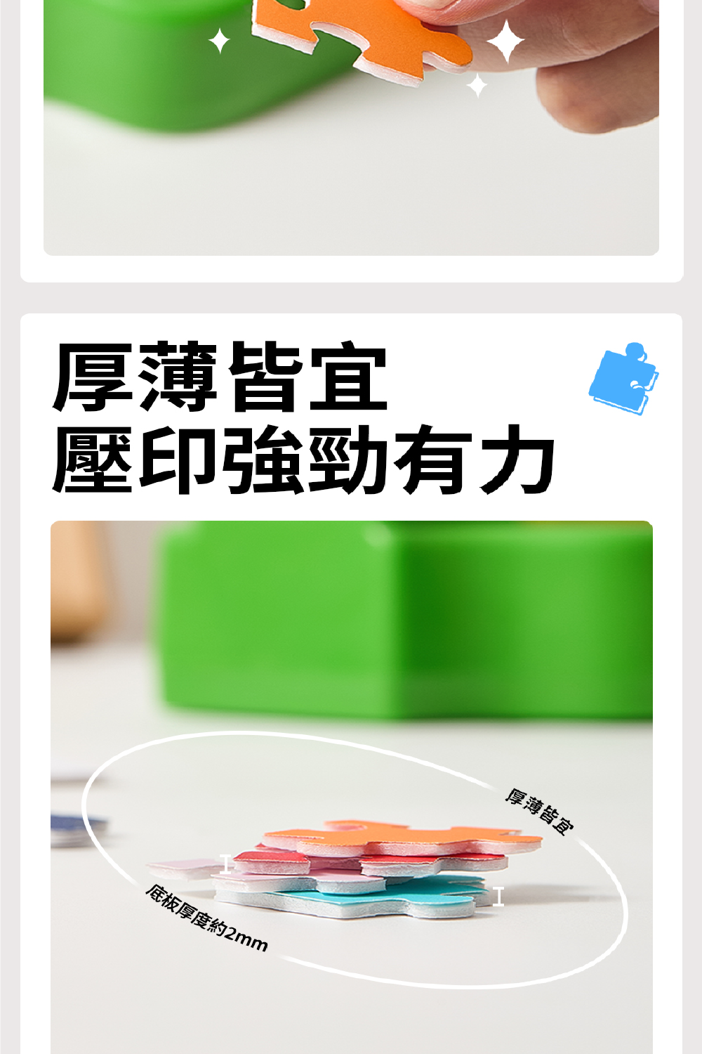 操作簡單好上手,在家就能DIY拼圖 從裁剪、貼合到壓製,完整體驗創作成就感 內建收納小抽屜,拼圖片不怕亂飛 拼圖厚度約2mm,小手好抓取、拼搭更穩定 培養專注力與邏輯思考 從平面畫紙到立體拼圖,訓練手眼協調與空間概念 送禮實用又有創意,親子共玩更有意義!